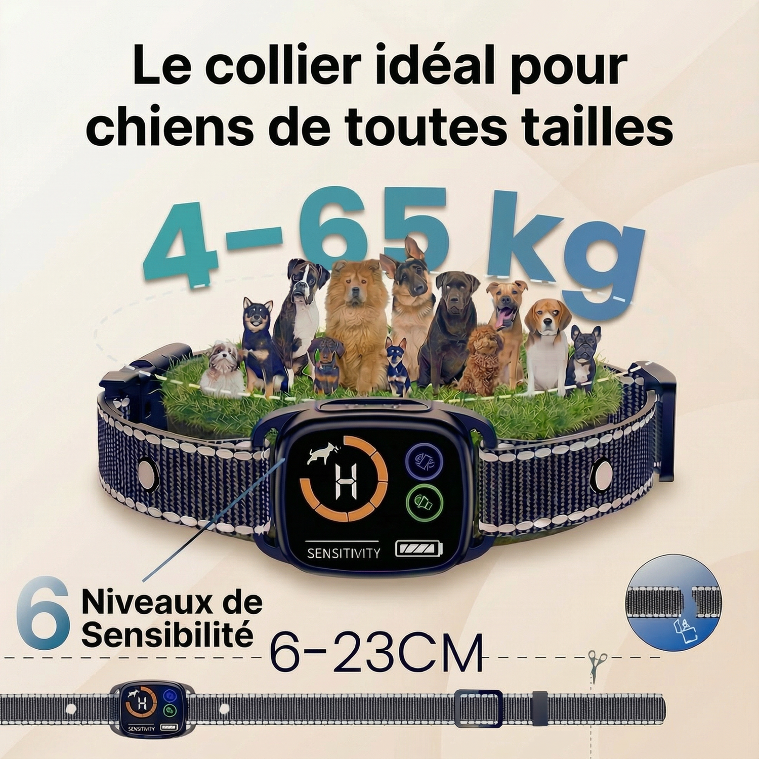 Oui. Grâce à son capteur intelligent réglable, notre collier fonctionne aussi sur les gros chiens comme le Berger Allemand, le Labrador ou le Husky. Les vibrations sont ajustables pour s’adapter à la sensibilité et à la taille de chaque chien.